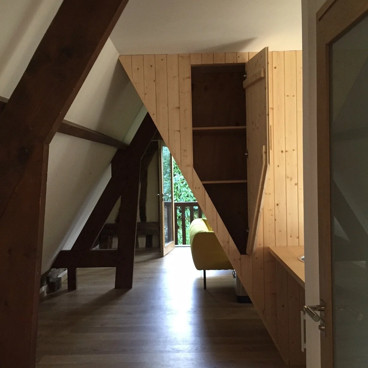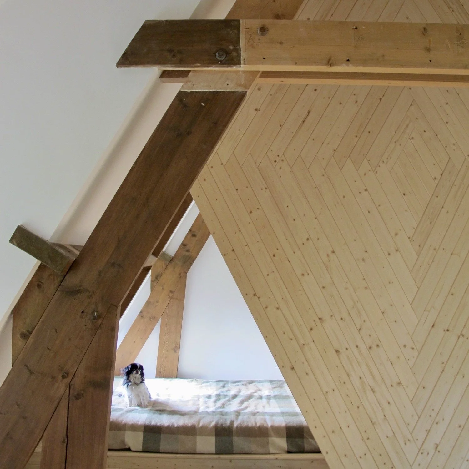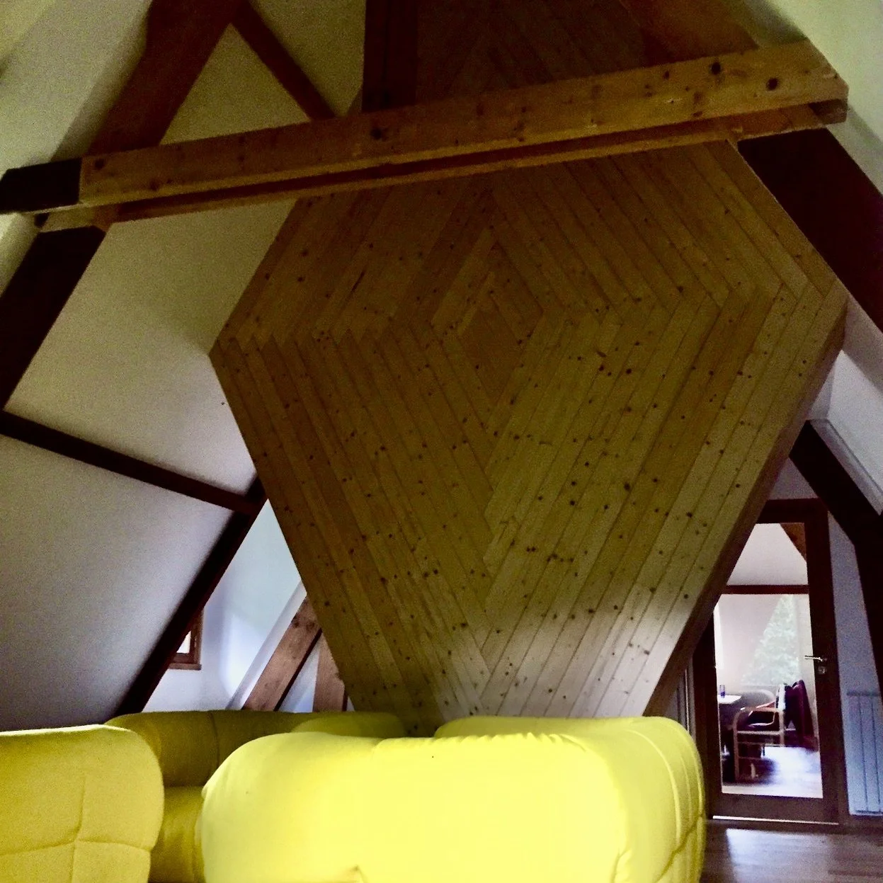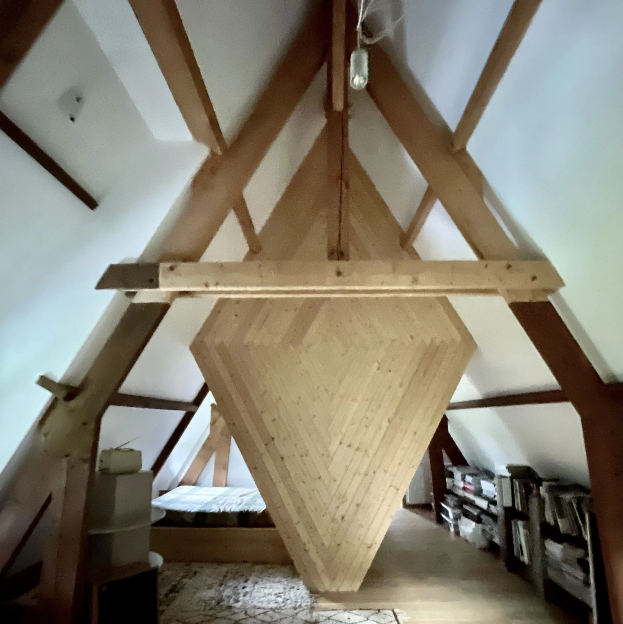 Renovation of the space above the garage. Removed the ceiling and divided the space with a diamond shaped cabinet.