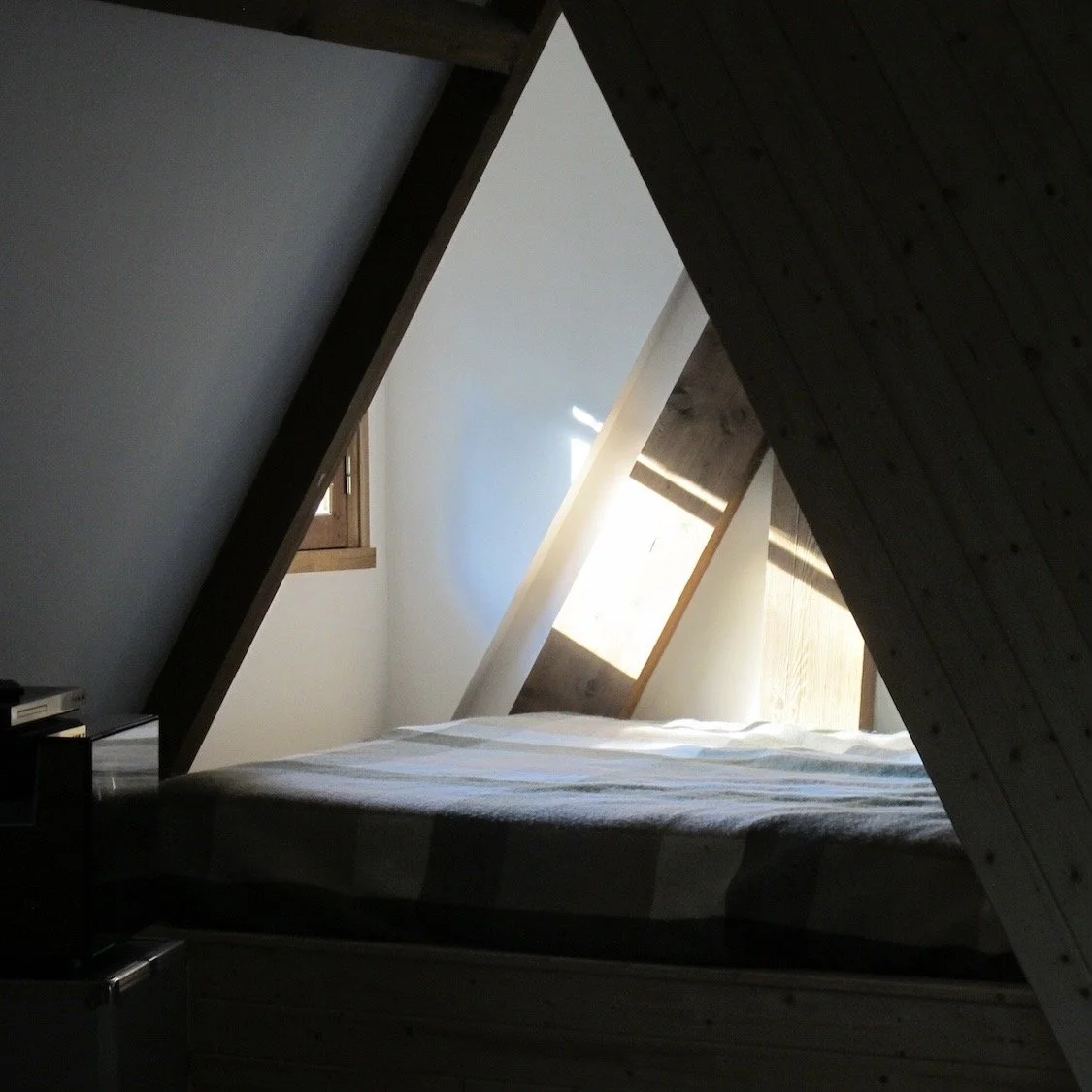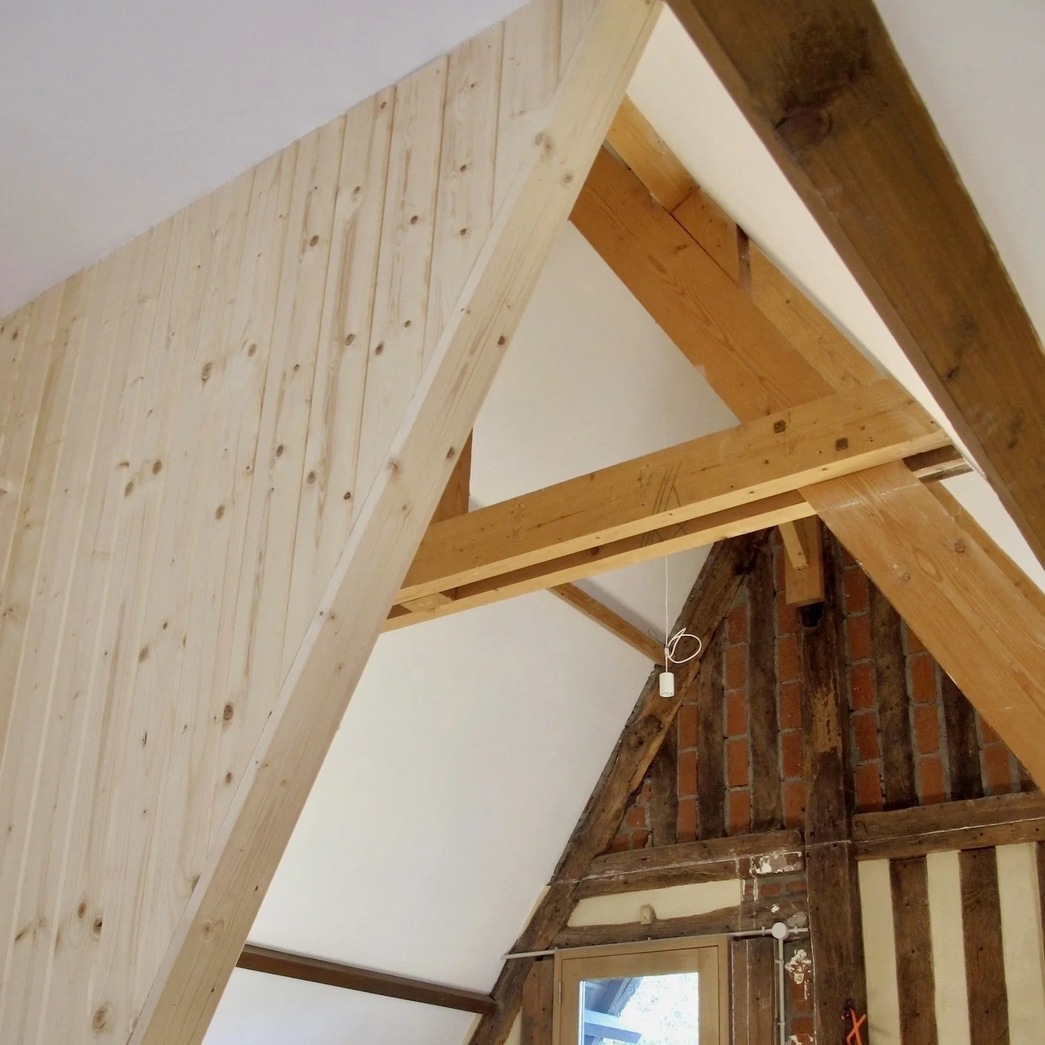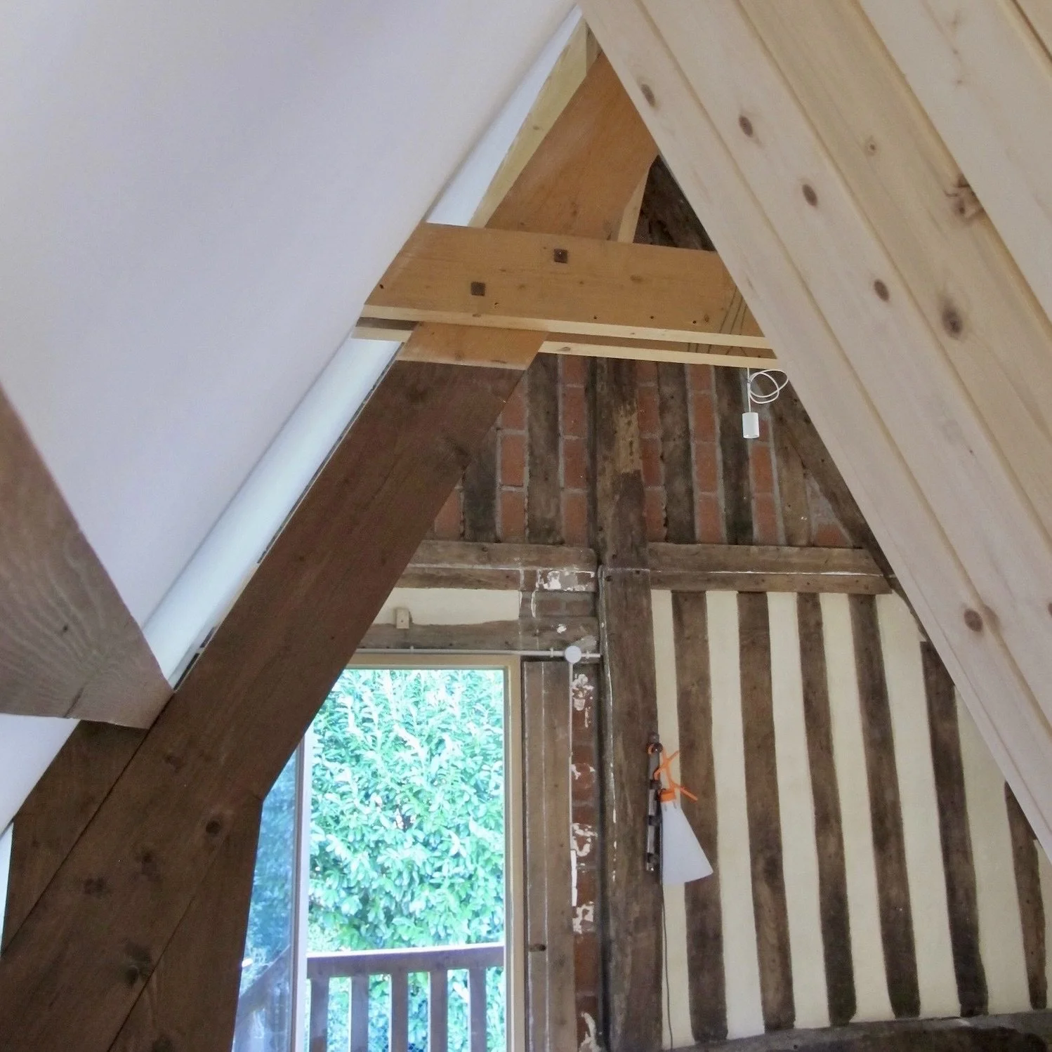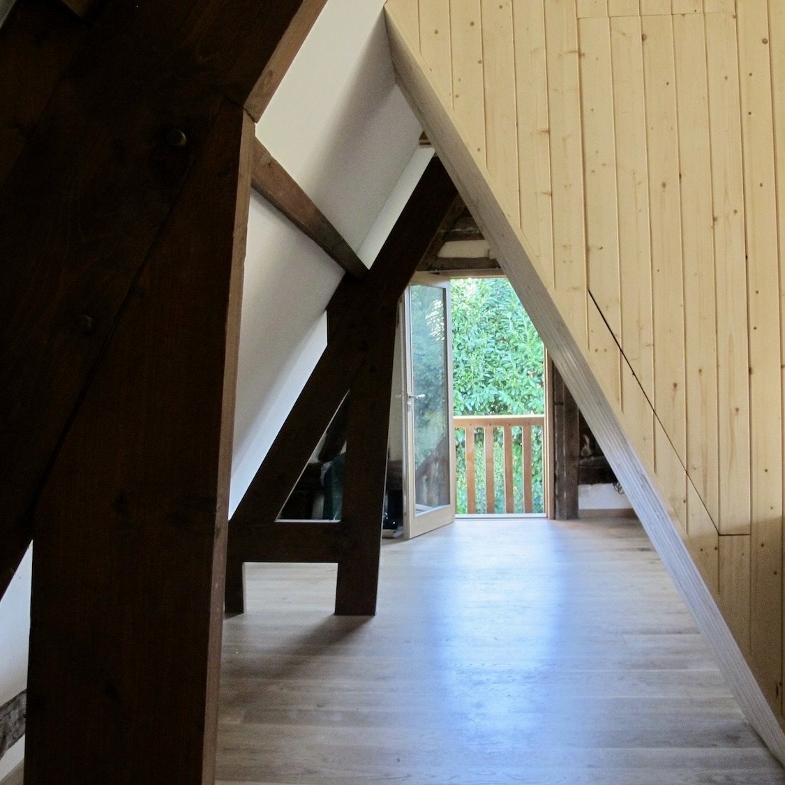 Renovation of the space above the garage. Removed the ceiling and divided the space with a diamond shaped cabinet.