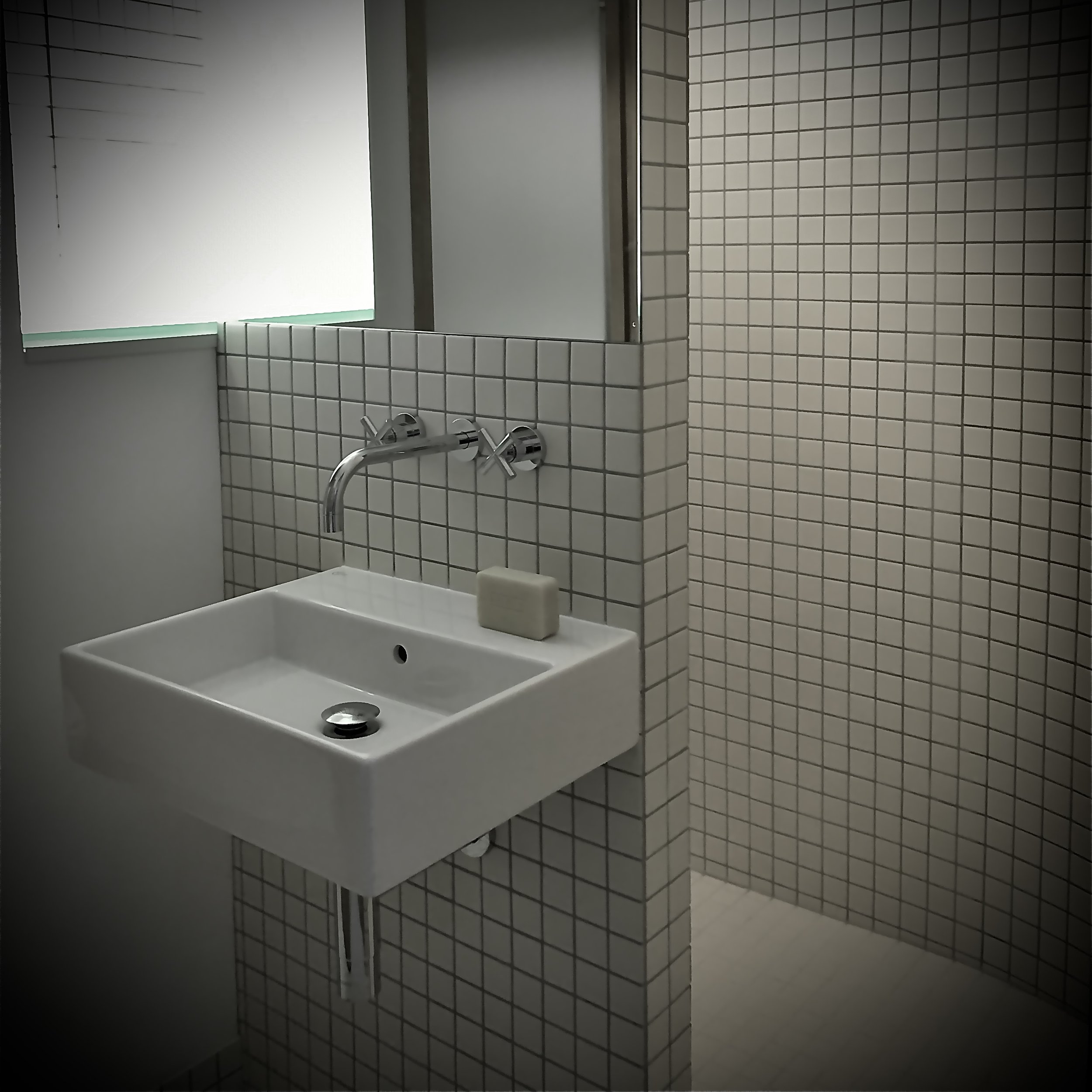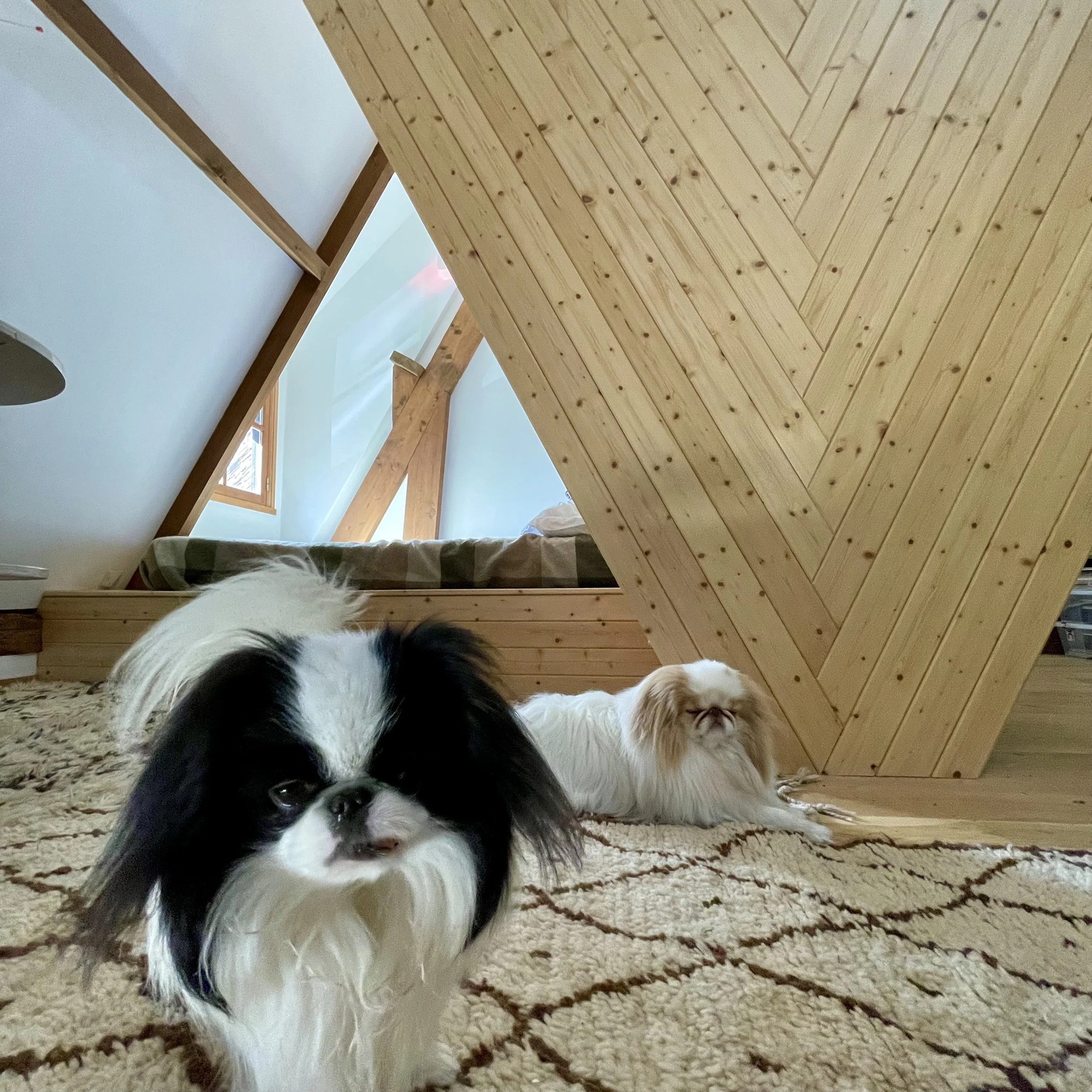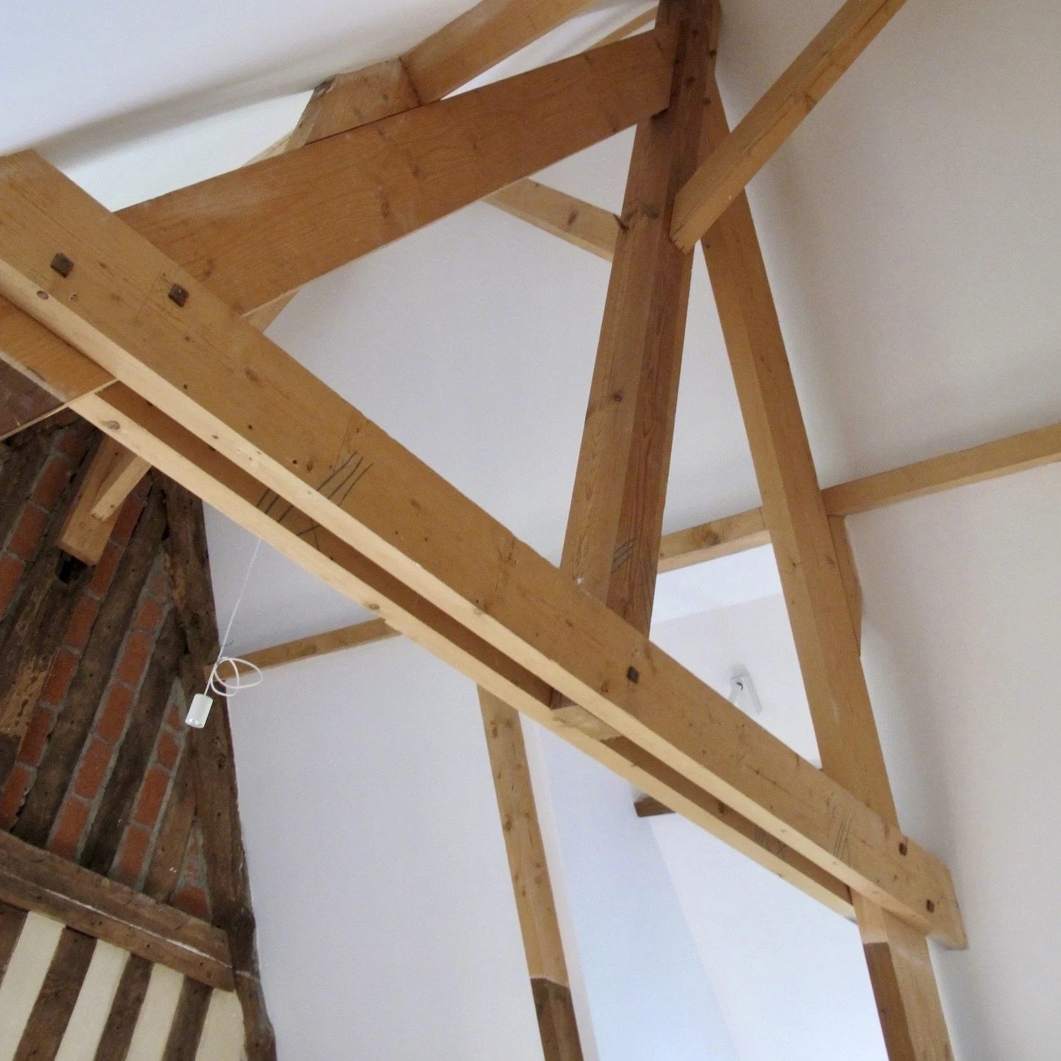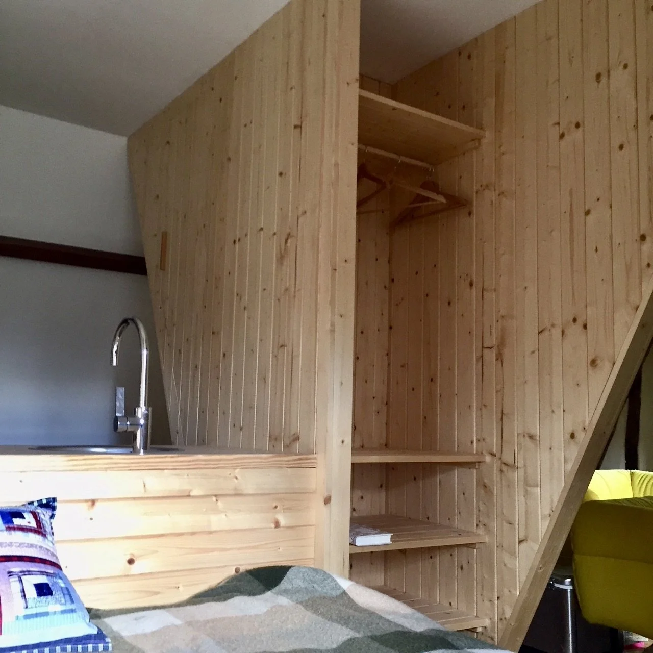Renovation of the space above the garage. Removed the ceiling and divided the space with a diamond shaped cabinet.